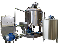 Восстановление сухих компонентов и дальнейшую пастеризацию смеси перед внесением в основной вакуумный котел, реактор или модуль, возможно осуществлять в отдельных смесителях-эмульгаторах, либо непосредственно вводить через специальную воронку в трубопровод циркуляции, через гомогенизатор-диспергатор посредством вакуума.