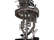 |  На крышке агрегата находится привод мешалки, люк для загрузки сухих компонентов, вакуумная камера для подключения аппарата к системе вакуумирования, патрубок для загрузки жидких компонентов. Крышка агрегата подъемная. Подъем крышки осуществляется посредством винтового подъемника, установленного на общей с емкостью раме. Винт подъемника приводится в движение мотором-редуктором. Внизу под емкостью в зависимости от продукта, вырабатываемого на данной установке, устанавливается либо гомогенизатор-диспергатор, сочетающий в себе работу гомогенизатора и роторно-пульсационного аппарата, либо специальный модуль насосных агрегатов. Модуль может состоять из гомогенизатора, насоса винтового, шестеренного и т.д. Тип насоса и гомогенизатора выбираются в зависимости от обрабатываемого ими продукта.Принцип работы вакуумного миксера гомогенизатора УГ-ГУРТ: